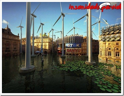 Piccadilly Circus virou uma lagoa calma, com vitórias-régias e turbinas de vento.