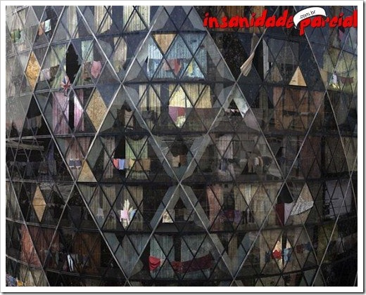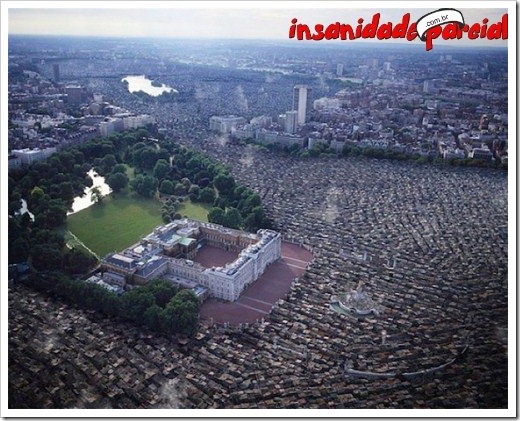 O palácio de Buckingham e outros prédios históricos aparecem rodeados por uma gigantesca favela de refugiados ambientais cadê o BOPE!?