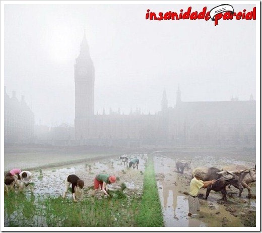 Os jardins de Westminster foram tomados por plantações de arroz, para lidar com a escassez de alimentos.